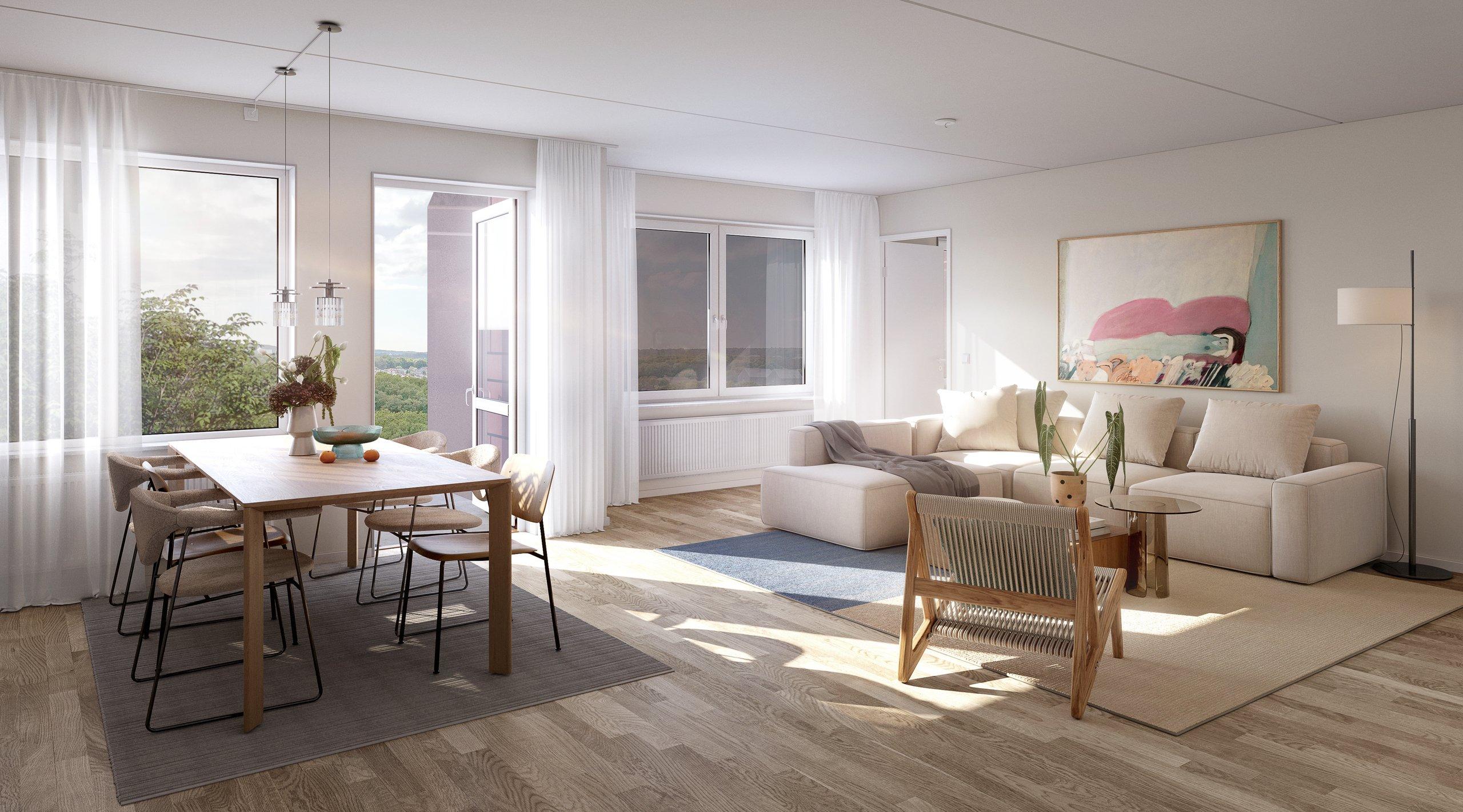 Det rymliga vardagsrummet är idealiskt för både avkoppling och socialt umgänge. Här får du plats med en stor soffgrupp med en naturlig plats för din TV och du kan duka upp med ordentligt långbord inför högtidliga firanden. Vardagsrummet och köket disponeras i en öppen planlösning och köket ligger i en vinkel vilket ger riktigt goda arbetsytor och det kommer såklart utrustat med den maskinella utrustningen som man kan önska från en modern bostad så som diskmaskin, ugn, induktionshäll, samt dubbla kyl/frys.