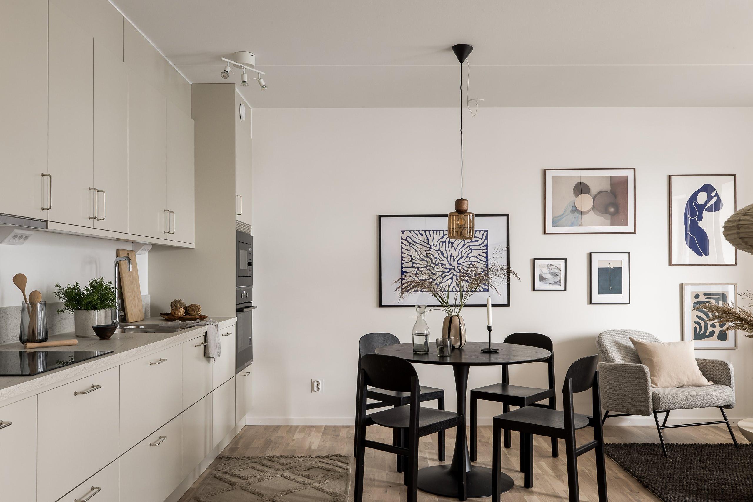 Den här yteffektiva tvåan på 49 kvadratmeter erbjuder en välplanerad planlösning med öppen koppling mellan kök och vardagsrum. Den generösa takhöjden på ca 2,85 meter ger en behaglig rymd som förstärker bostadens luftiga karaktär.