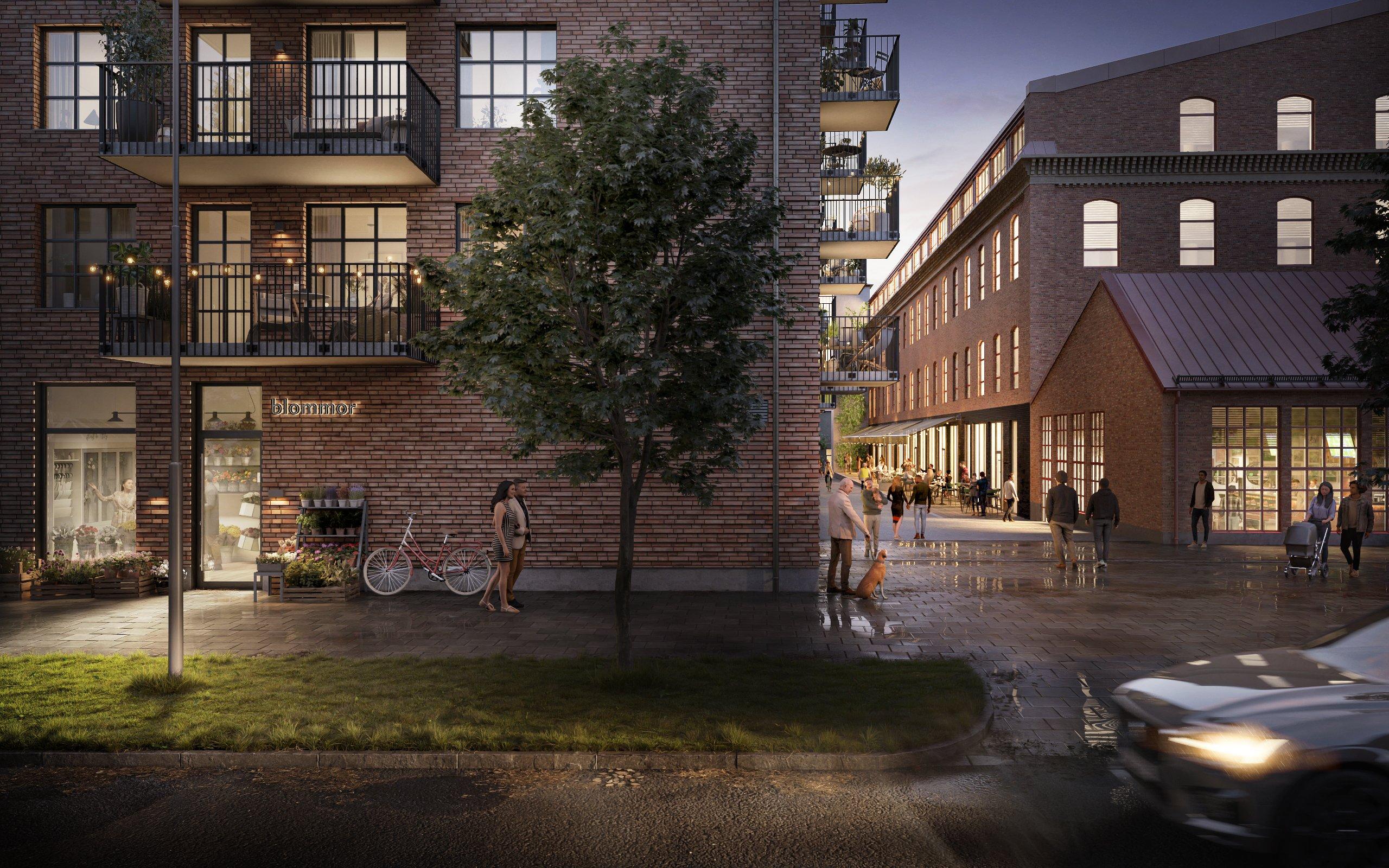 Här är det tänkt att pulsen ska märkas. Spinnerifabriken tar sin givna plats i den livliga miljön i Gamlestadens Fabriker och på entréplanet finns en mindre lokal med plats för en butik eller annan verksamhet som gör huset levande. Entréernas stora glaspartier gör att gatan och byggnaden får kontakt – det känns öppet, tryggt och inbjudande. Innanför väntar en lugn och skön innergård med grönska där du kan landa efter en dag på språng.