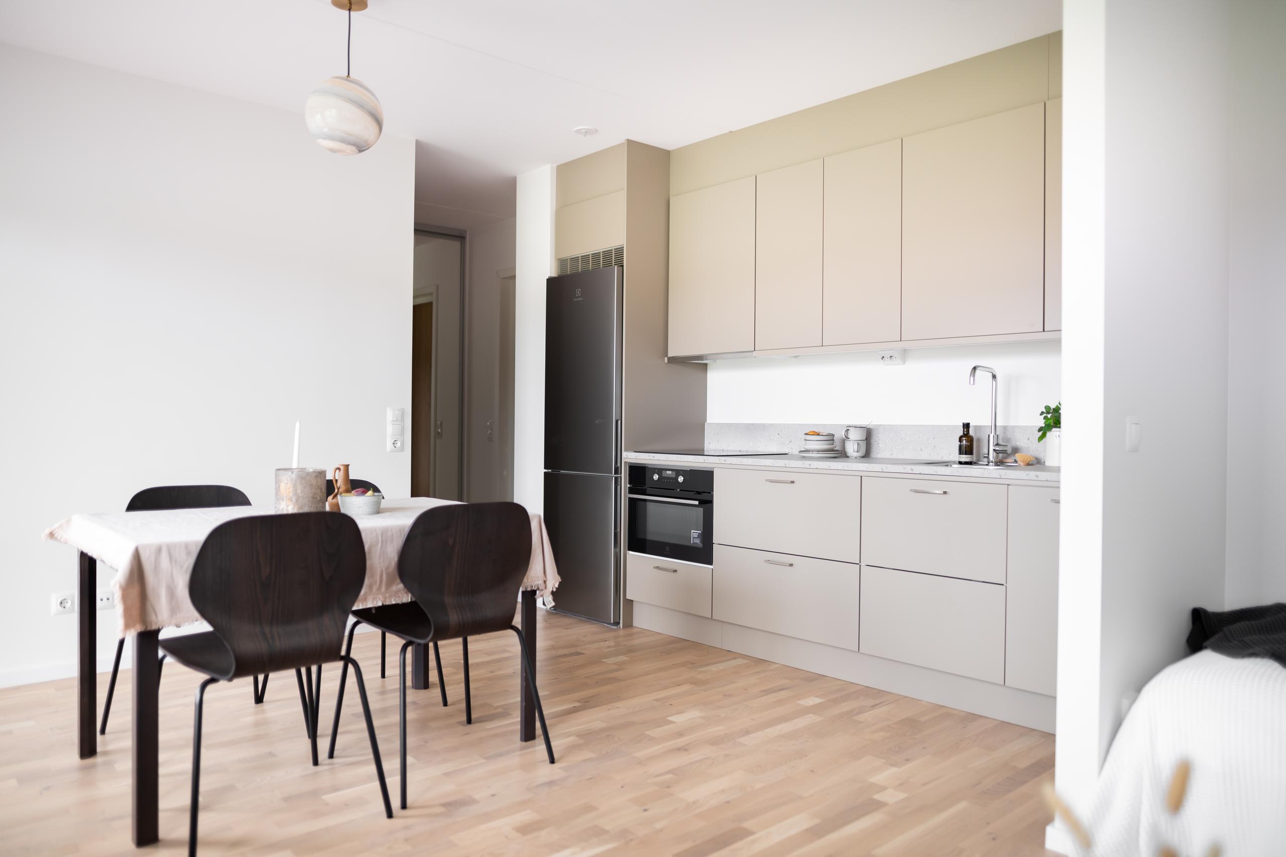 I köksdelen finns induktionshäll, kombinerad ugn/mikro, diskmaskin samt en kombinerad kyl och frys.