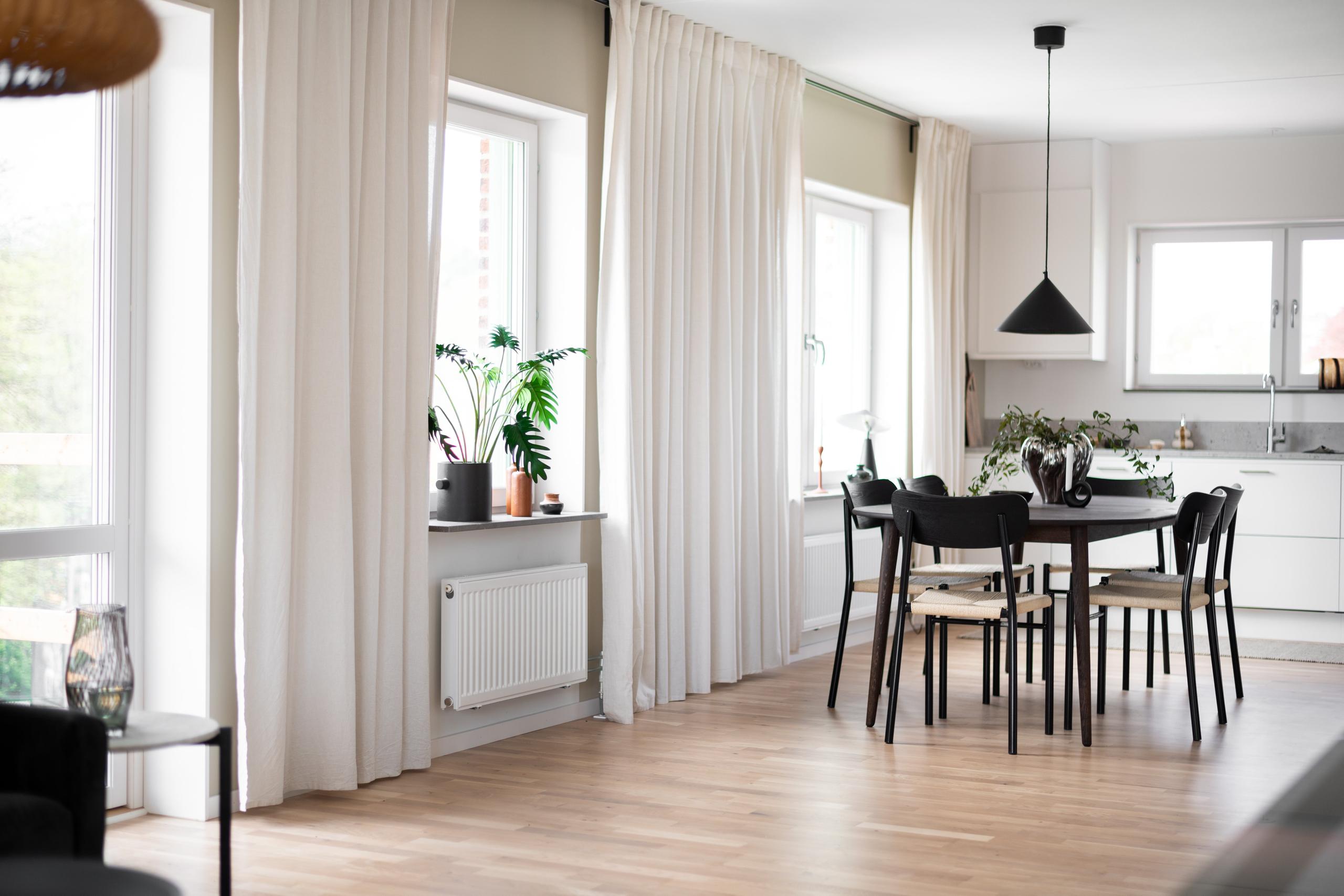 Vidare in i bostaden finner ni de sociala ytorna i ett sammanhängande kök och vardagsrum. Här finns gott om plats för ett större köksbord med tillhörande stolar. Köket är placerat i vinkel och är utrustat med induktionshäll, mikrovågsugn, dubbel kyl/frys och helintegrerad diskmaskin. Gott om förvaring med både överskåp och lådor. För den som önskar går det även att lägga till en köksö.