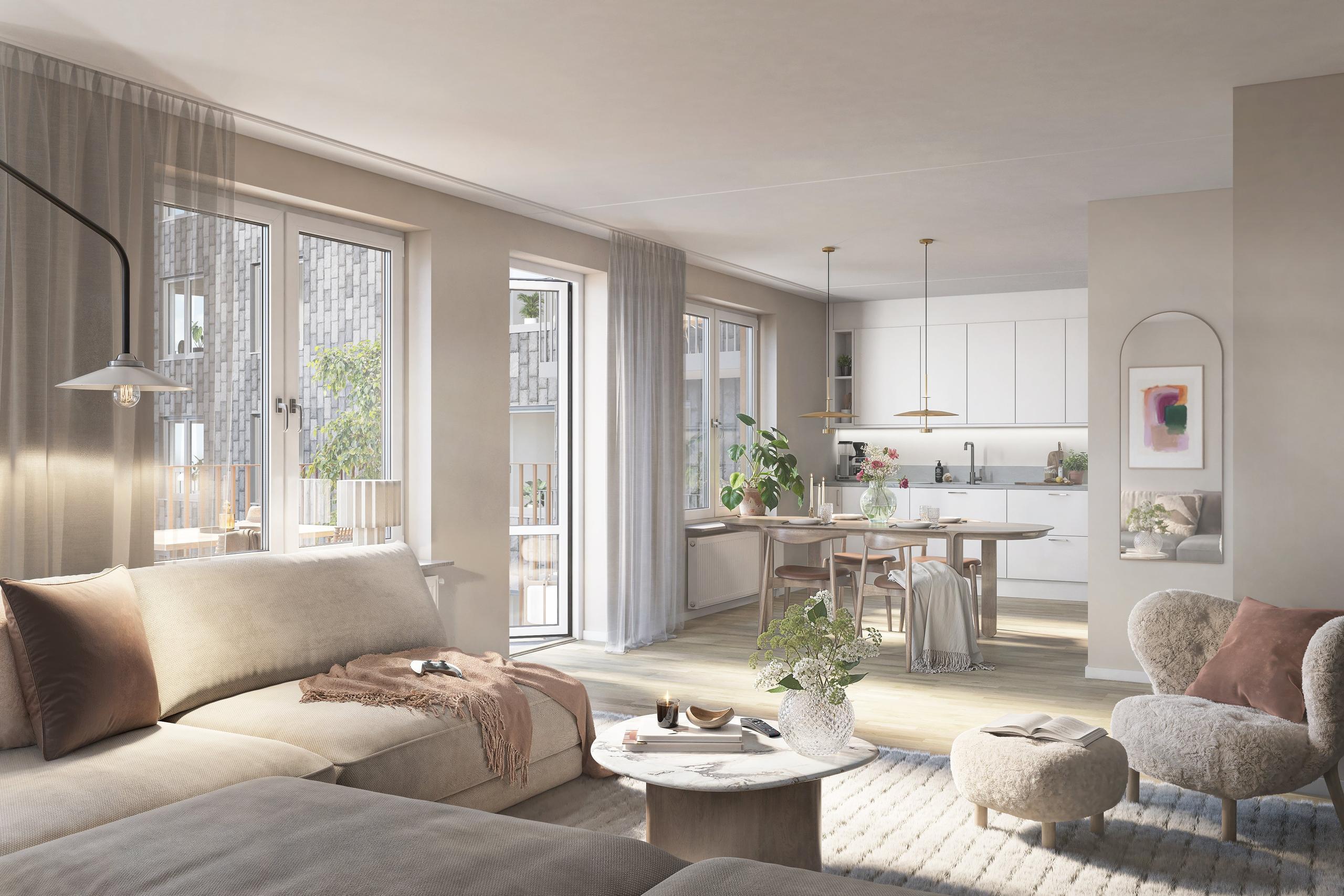 Vi har satsat på tidlösa material i lägenheterna för att bostaden ska stå sig genom både trender och slitage. För oss är hållbarhet både vackert och självklart, i JM Original ser du vårt bidrag till långsiktig design och hemmakänsla. Naturmaterial som ekparkett, kalkstensskivor i fönstren samt klinker och kakel i kök och bad utstrålar kvalitet och åldras med värdighet.