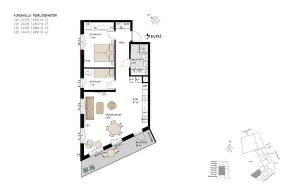 Låt matplatsen, som ryms invid fönster, bli en naturlig avskärmning mellan kök och vardagsrumsdel. Matplatsen rymmer såväl familj som gäster och möjliggör till långa middagsbjudningar. Vardagsrummet är lättmöblerat med plats för mysig soffhörna och mediamöbel. Härifrån kan ni öppna ut mot balkongen i sydost.