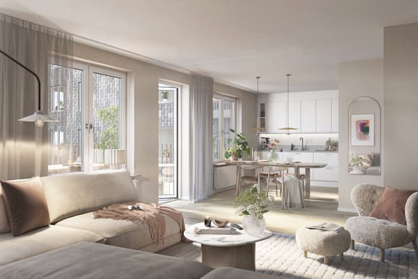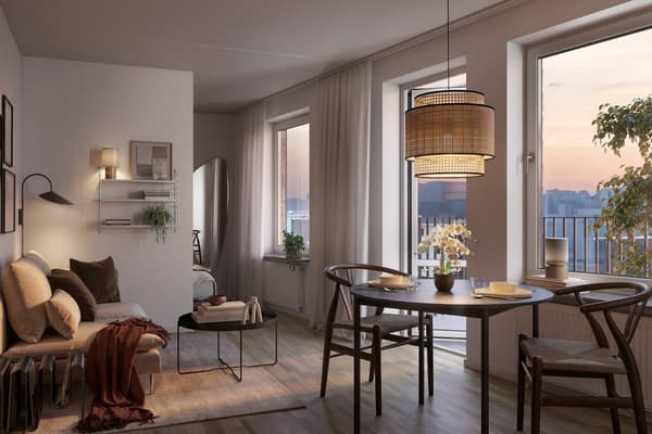 Därtill finns gott om plats för matgrupp och soffhörna för umgänge med nära och kära. Sommartid förlängs ytorna ut till den trevliga balkongen i sydväst.