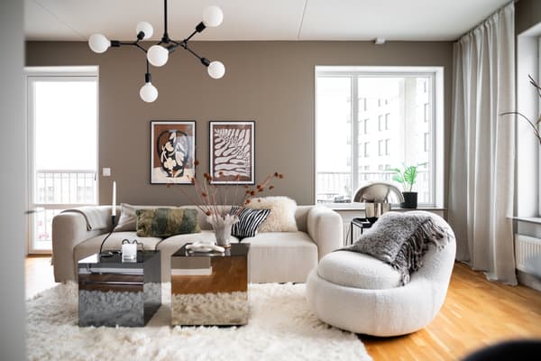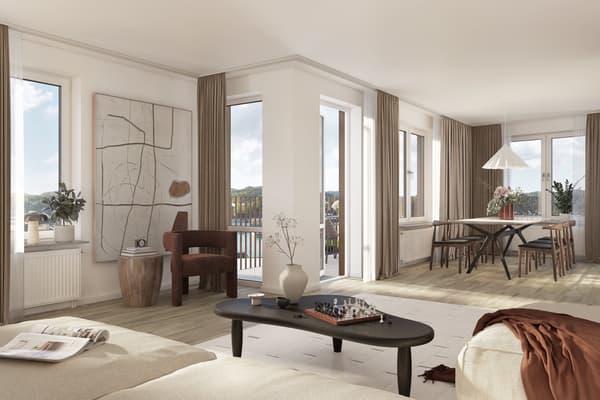 Invid fönster finns gott om plats för matgrupp där du dukar upp till såväl vardagsmiddagen som festmåltiden. Matplatsen blir en naturlig avdelare mellan kök och vardagsrum. Vardagsrumsdelen har i sin tur plats för soffgrupp, tv-möbel och vidare möblemang. Med fönster i två väderstreck får du ett trevligt sällskapsrum att vistas i och sommartid öppnar du fördelaktigen upp till balkongen.