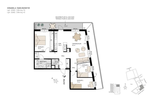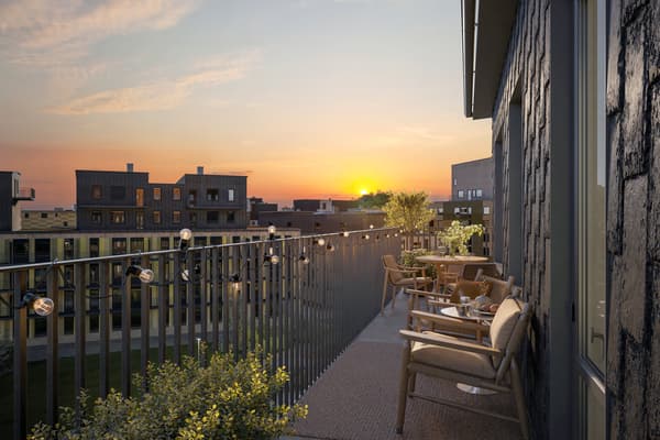 Vardagsrummet i sin tur har plats för soffgrupp, tv-möbel och vidare möblemang. Sommartid öppnar du fördelaktigen upp till balkongen i västerläge med utsikt den blivande kommunala parken.