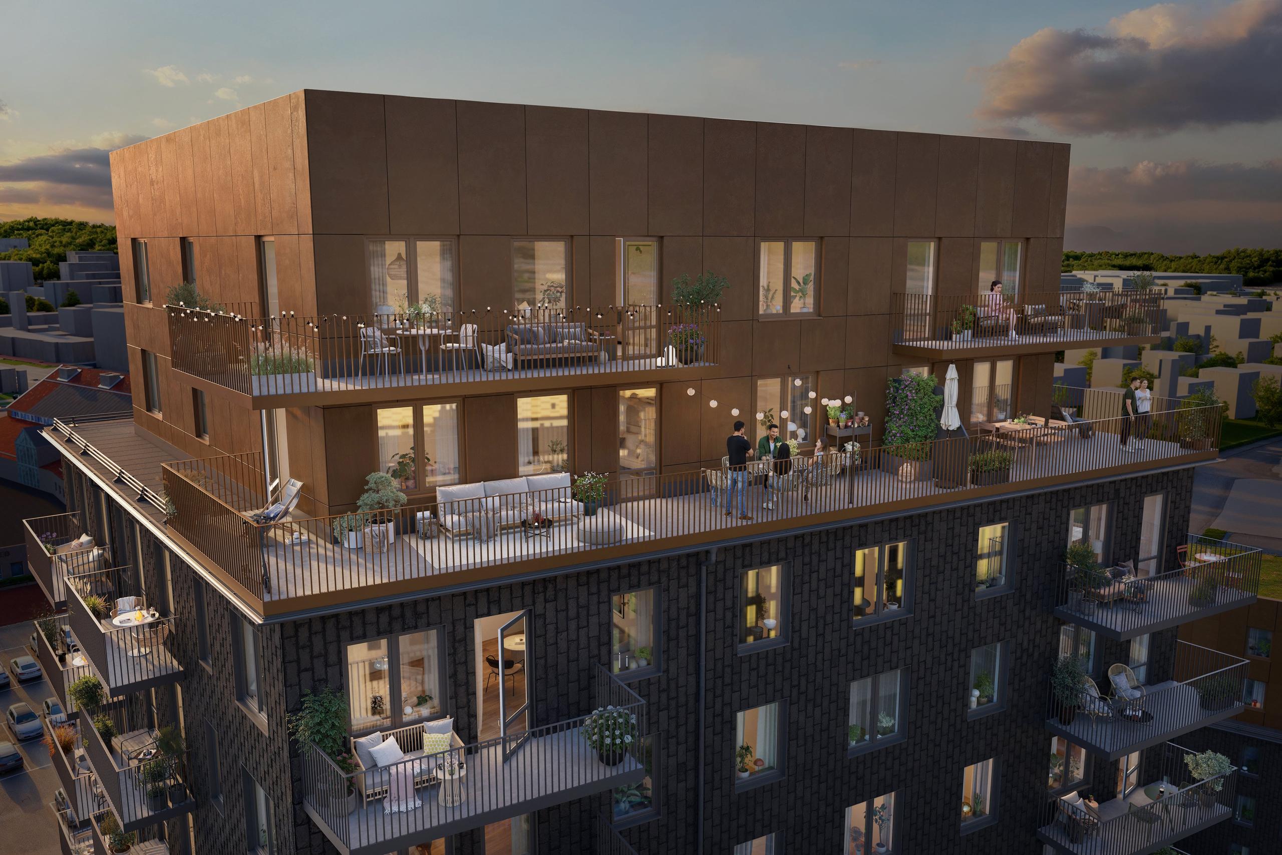 Den svarta skifferfasaden i Solhöjden är byggnadens signum. Lägg därtill fasadskivor i koppartoner på huset högsta del som skapar läckra effekter i mötet mellan olika material. Variationsrikedomen syns även i höjdskillnader mellan byggnadens olika delar, där den högsta delen på 14 våningar bjuder på magnifik utsikt från sina övre plan. Indragna takvåningar samt väl tilltagna terrasser och balkonger är också några av Solhöjdens kvaliteter.