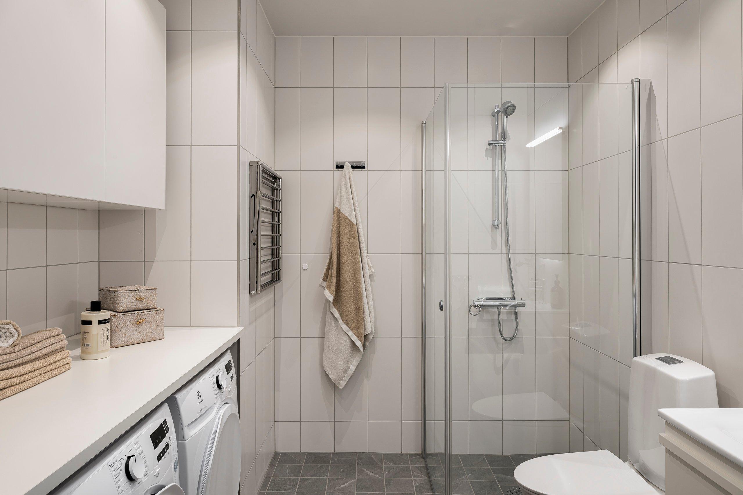 Stig in i hallen som möter dig med generösa förvaringsytor bakom kvadratsmarta skjutdörrar i spegelglas. Rakt fram från entré och centralt placerat mellan sociala och privata delar är det helkaklade badrummet beläget. Duschhörnan har svängbara dörrar i klarglas, något som öppnar upp för mer utrymme. Här finns gott om förvaring i vägghängd kommod och flera väggskåp. Under arbetsbänken finner du tvättmaskin och torktumlare, för att smidigt hantera klädvården i vardagen. Inget mer spring till tvättstugan här inte!