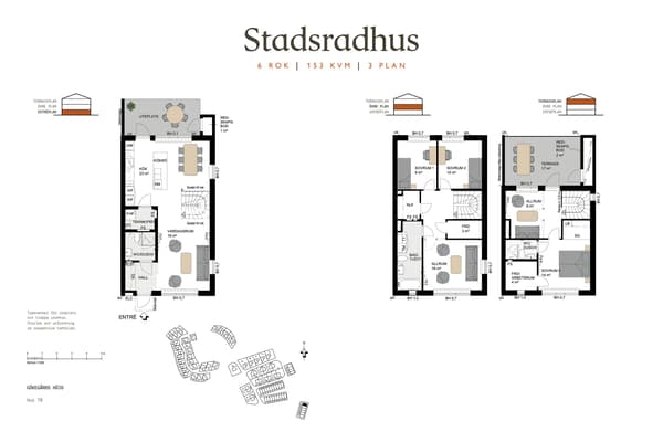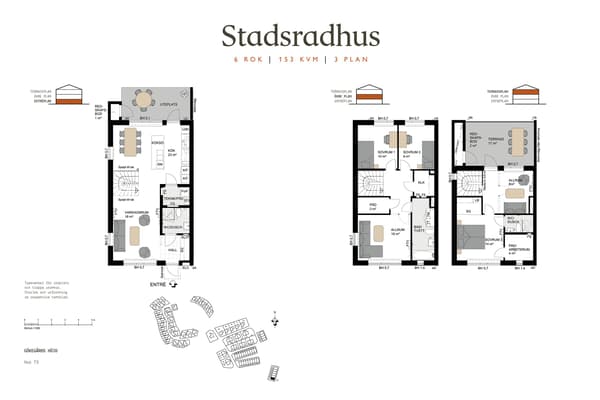 Entréplanet välkomnar med en generös hall och ett badrum med dusch. Här finns även kök och vardagsrum i öppen planlösning – en inbjudande yta för familjeliv och umgänge. Köket har en stor köksö som inbjuder till matlagning och samtal. För extra mysfaktor till vinterbjudningarna kan ni göra tillval av en braskamin i vardagsrummet som skapar värme och trivsel.