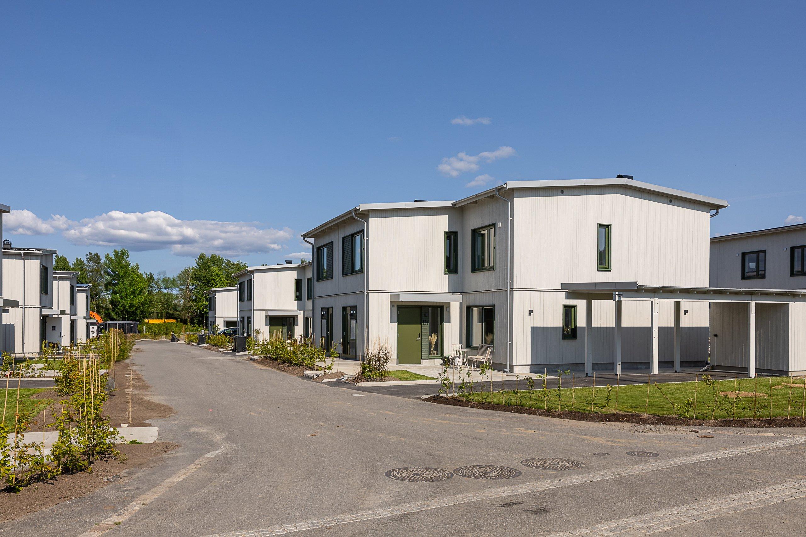 Här finns ett praktiskt och stilrent kök som är öppet mot det generösa vardagsrummet. Entréplanet har även ett badrum med dusch. En våning upp finns familjens sovrum samt badrum med badkar. Om det behövs fler sov- eller arbetsrum går det att ordna ytterligare ett i entréplan. Med en fin träpanel i gråvit kombinerat med mörkgröna detaljer smälter husen fint in bland övriga villor i området. Samtliga parhus har solceller på taken.